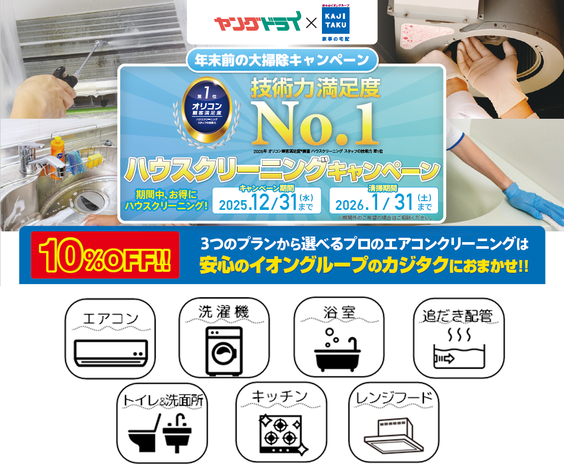 エアコン・洗濯機・浴室・追い炊き配管・キッチン・レンジ・トイレ&洗面所+各オプション が対象です